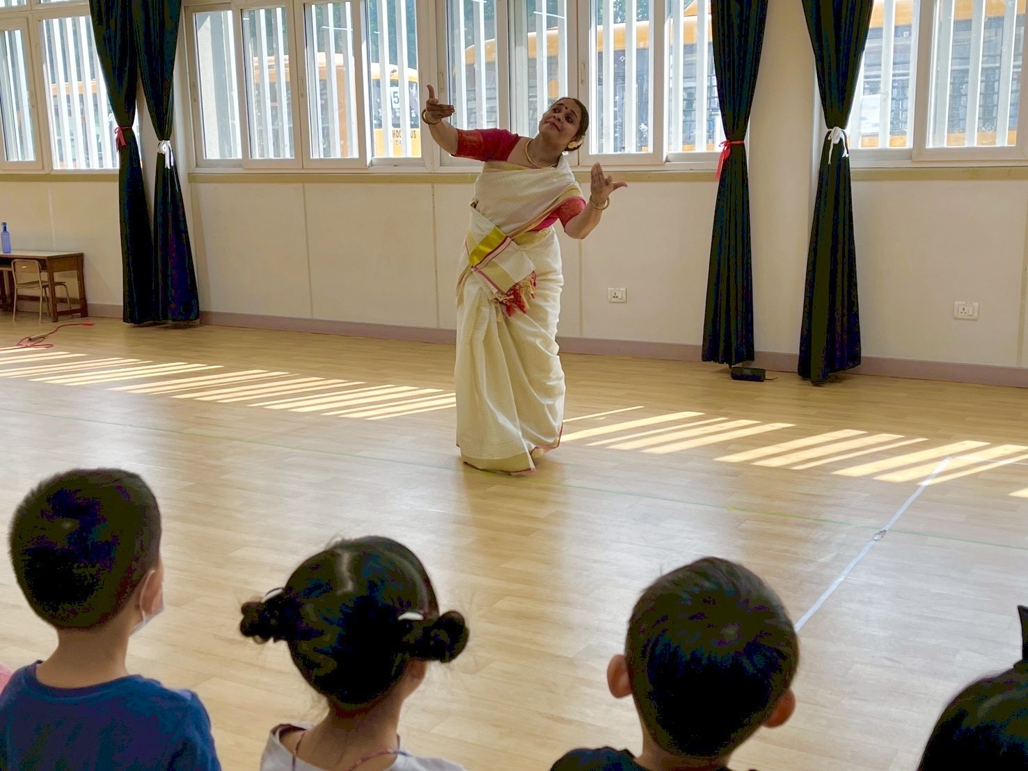 次にインドのケーララ州の伝統舞踊、『モヒニヤッタム』を、2名のダンサーさんに披露してもらいました。普段はなかなか見ることのできないダンスに、子どもたちは興味津々でした!